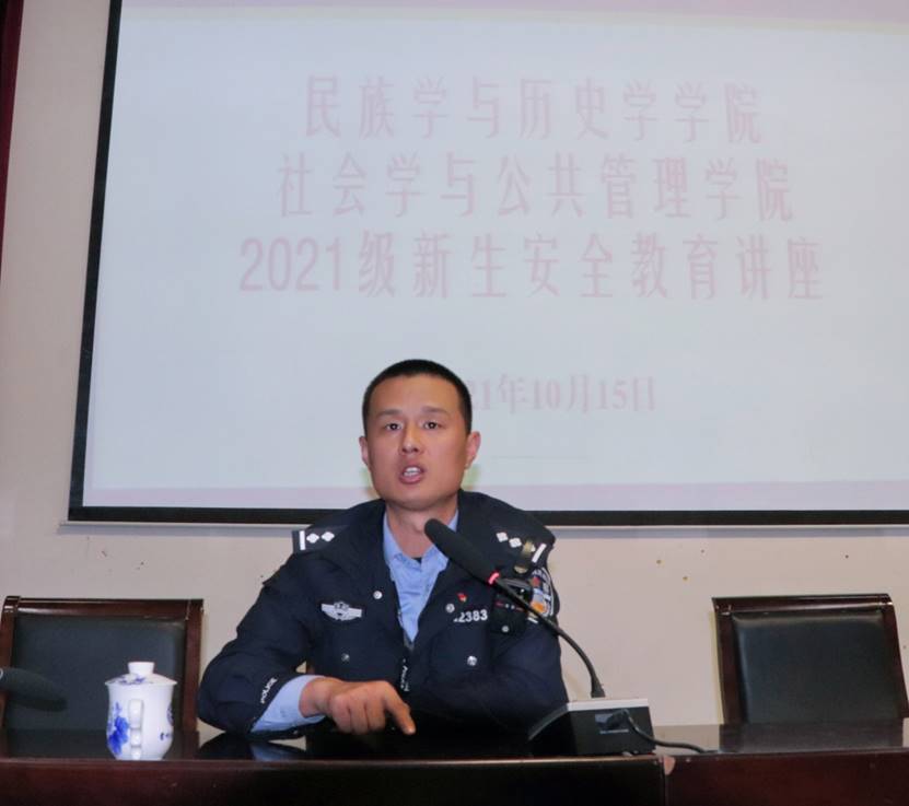 为了帮助同学们更好的了解和感知身边的网络安全风险,增强网络安全意识,杜绝网络诈骗的情况发生,2021年10月15日16:40,民族学与历史学学院于15栋圆形会议室举行2021级“新生安全教育讲座”。本次讲座由花溪区松山派出所警官兼校外辅导员赵普林进行相关知识的宣讲。