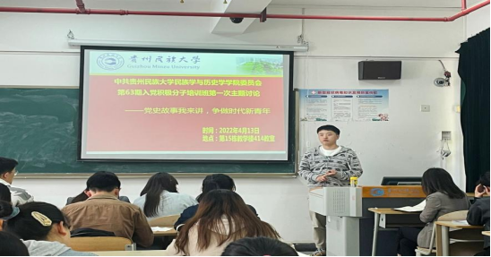 民族学与历史学学院委员会在花溪区第15栋414教室开展第63期入党积极分子培训班第一次主题讨论会,学院组织员、党委委员何慧琳老师围绕“党史故事我来讲,争做时代新青年”的主题展开,以分组讨论选派代表发言的形式进行,特邀学院吴桐老师为讨论会做点评和总结。