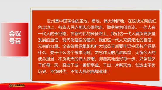 邝小军同志从省第十三次党代会的召开入手,分别就贵州过去五年的历史性成就,今后五年的总体要求和奋斗目标、推动高质量发展的重点任务坚定不移推动“四化”、毫不动摇加强党的建设四个方面进行。
