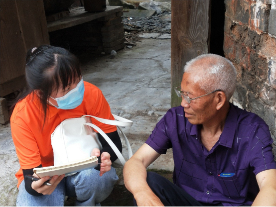 图为实践团成员向村民爷爷讲解毒品知识。