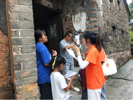 图为实践团成员在司蒙村给村民填写禁毒防艾知识调查问卷。
