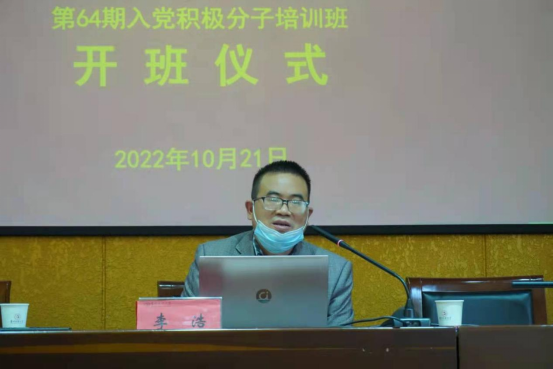 接着,李浩副书记为本次开班仪式做动员讲话,对成功进入培训班的学员表示热烈祝贺,他对大家提出,入党积极分子要端正入党动机,入党是光荣的也是对个人的考验,同学们要以入党为荣,团结集体、明确目标、提高思想认识、不断强化自身综合素质。提醒同学们要认真听好每一节课,做好笔记,在培训期间,严格遵守纪律,积极主动学习,做到思想和行动上向党组织靠拢。