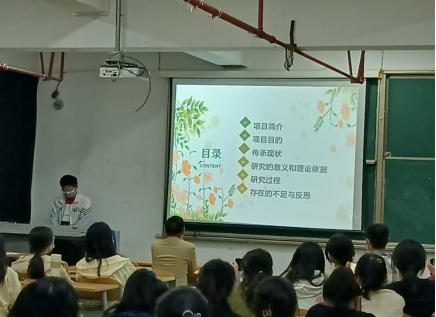 汇报交流会由2020级文化产业管理专业刘洋同学担任主持人。在主持人介绍完出席老师后,石霞雨同学首先进行题为“民族特色村寨可持续发展探索——以贵州省从江县岜沙苗寨为例”的项目汇报,何云同学则以“‘盘州古银杏文化——一体两翼'发展模式探析”为题进行了汇报。第三位汇报人是田苗同学,她的汇报题目是“茶文旅融合背景下石阡苔茶产业的新发展模式——以贵州祥华生态茶业为例”。第四位汇报人是龙小毛同学,他的项目名称是“贵州省少数民族民间歌舞文化的创造性转化和产业化发展——以松桃瓦窑四面花鼓为例”。最后一位汇报人是王依婷同学,她汇报的项目名称是“黔南州雷山县非遗扶贫就业工坊转型升级机制研究”。在每一位汇报人汇报结束后,在场的老师对开展项目的重点和思路、文献资料的搜集准备、田野调查的方法等提出了意见建议。