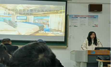 第一位汇报同学为杨林梅,汇报主题为“文旅结合背景下黎平侗族风情民宿创新运营模式探析”。杨林梅分析了黎平侗族民宿发展的现状和存在问题,并从文旅融合的角度提出了创新性的对策。