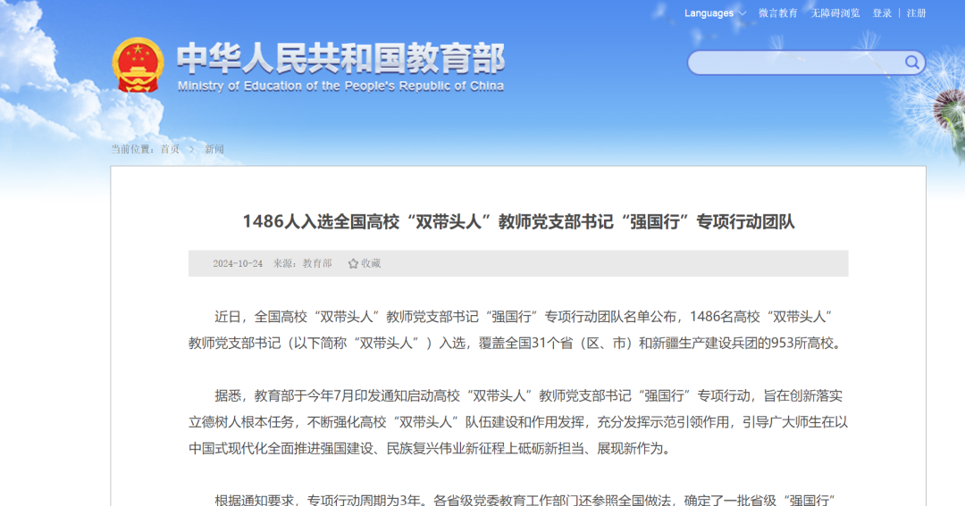 据悉,教育部于今年7月印发通知启动高校“双带头人”教师党支部书记“强国行”专项行动,旨在创新落实立德树人根本任务,不断强化高校“双带头人”队伍建设和作用发挥,充分发挥示范引领作用,引导广大师生在以中国式现代化全面推进强国建设、民族复兴伟业新征程上砥砺新担当、展现新作为。根据通知要求,专项行动周期为3年。各省级党委教育工作部门还参照全国做法,确定了一批省级“强国行”专项行动团队。入选的高校“双带头人”将在行动周期内,聚焦服务国家重大战略和地方经济社会高质量发展,积极开展党建联建、教育服务、科技赋能、实践育人等各项任务,充分发挥辐射带动作用,引领广大青年师生在专项行动中深刻认识新时代党和国家事业取得的历史性成就、发生的历史性变革,立报国强国大志向、做挺膺担当奋斗者。教育部思想政治工作司有关负责同志表示,此次专项行动是贯彻落实党的二十届三中全会和全国教育大会精神的重要举措,也是提升高校教师党建和思想政治工作质量的重要途径,将进一步健全工作机制,强化资源统筹,加大支持力度,坚持以高质量党建引领推动教育、科技、人才“三位一体”协同融合发展,确保“强国行”专项行动有力开展、取得实效。