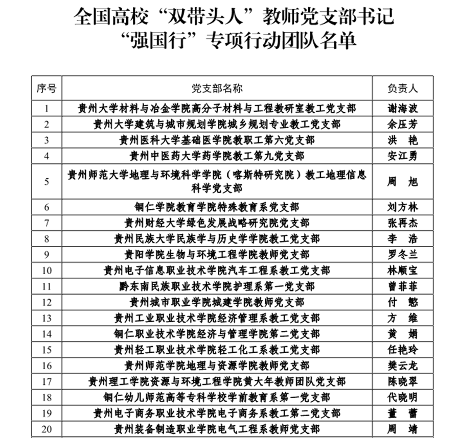 近日,全国高校“双带头人”教师党支部书记“强国行”专项行动团队名单公布,1486名高校“双带头人”教师党支部书记(以下简称“双带头人”)入选,覆盖全国31个省(区、市)和新疆生产建设兵团的953所高校。其中,贵州省有20人入选高校“双带头人”教师党支部书记。一起来看