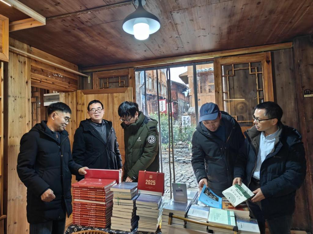 民族学与历史学学院西江苗寨教学实践基地进行实地考察。在学院、地方党委政府、景区公司的大力支持下,该基地于2016年创办,长期致力于民族文化的挖掘、研究、传承与产学研一体化发展,同时开展民族文化旅游研究与人才培训工作。团队先后参观了基地内的西江书局与西江讲堂。在西江书局,调研人员浏览了基地多年来收集、整理及出版的丰富地方文献、学术著作与文化读物,对其在文献保存与知识传播方面所做的扎实工作表示赞赏。在西江讲堂,基地学生陆群艳向调研组详细汇报了基地自成立以来的发展历程、主要开展的田野调查项目、文化交流活动以及服务地方社会的具体实践,展现了其连接高校学术与地方田野的桥梁作用。