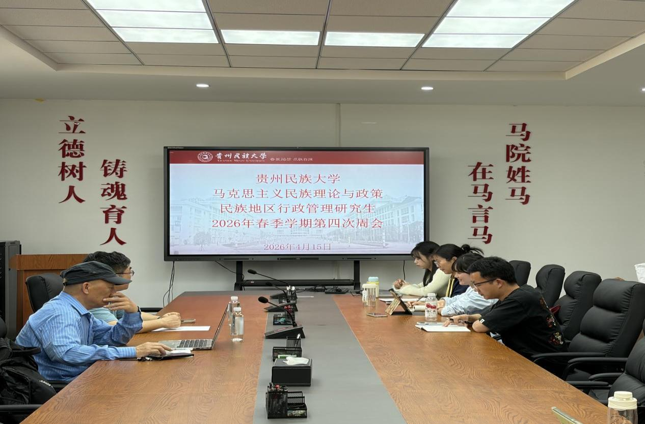 2026年4月15日(周三)16点30分,民族学与历史学学院马克思主义民族理论与政策研究生2026年春季学期第四次周会在马克思主义学院529会议室召开。此次会议主要围绕“研一同学代表作寒假期间学习与调研情况汇报”展开,由25级研究生王洪玉、胡佳莹、胡超3位研一同学代表作汇报。杨昌儒教授、冯志伟副教授出席本次会议,其余研究生旁听会议。