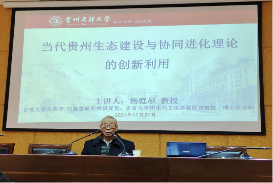 杨庭硕教授的讲座紧扣时代主题,科学分析了贵州目前面临的发展现状,分别从生态建设的实质、贵州省生态问题现状、贵州生态建设与协同进化理论之间的关系三个方面展开论述。