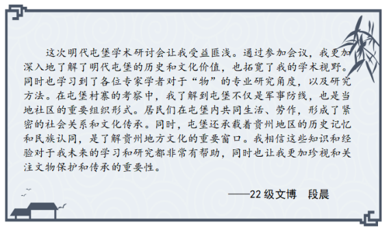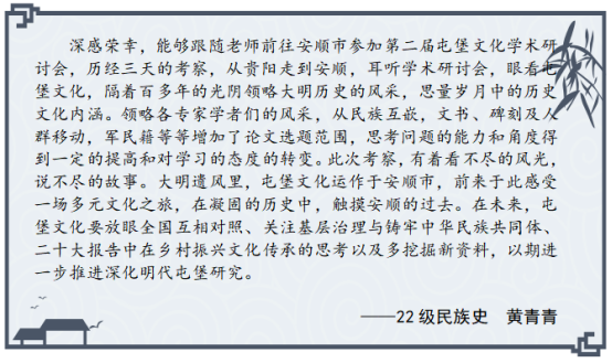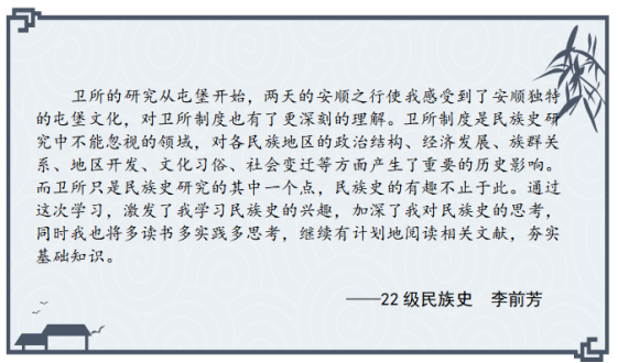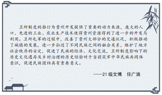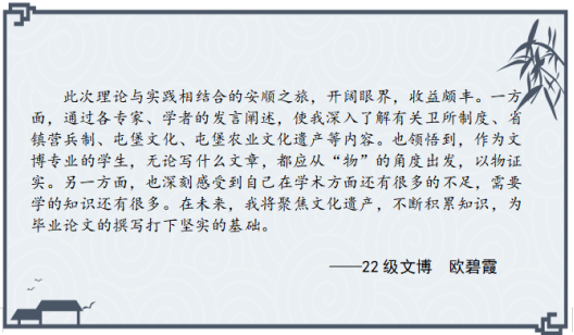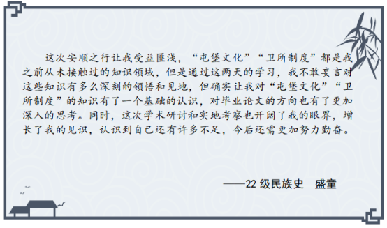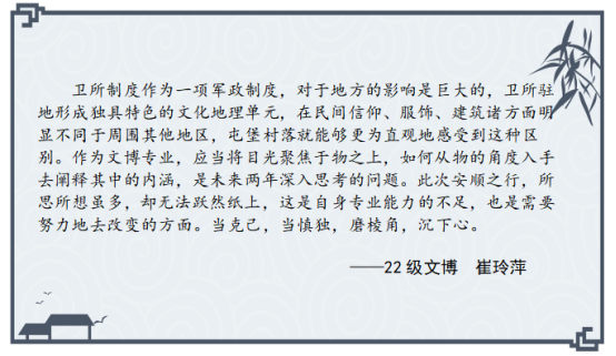 开展“学与思”系列研学活动的重要尝试,参会的硕士研究生在理论学习与实地考察中受益匪浅,感悟颇多,激发了他们对卫所制度的兴趣,有助于提升专业素养,扩大学术视野,促进论文选题。以下是参会硕士研究生的思考摘录。