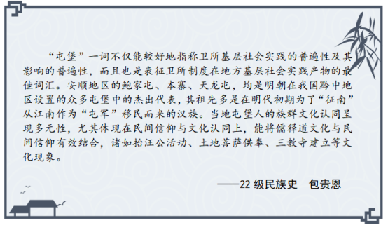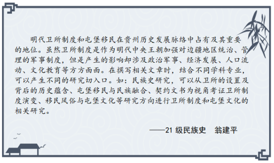 卫所制度是明清时期的一项军事制度,正式创立于明代。明朝建立后,从沿海到内地,从腹地到边疆,均以卫所镇戍,寓兵于农,守屯结合。贵州是明代卫所设置与移民的重要区域。自明代以来,庞大的汉族移民群体在贵州各地驻扎生根,对贵州的政治统治、经济文化、社会结构、民族关系、地方治理等产生了深远的影响。因卫所制度而产生的研究领域,包括政治史、制度史、军事史、经济史(军屯)、文化史(历史移民、卫学)、社会史、民族史等诸多领域,是可以深入开拓和耕耘的学术重地。