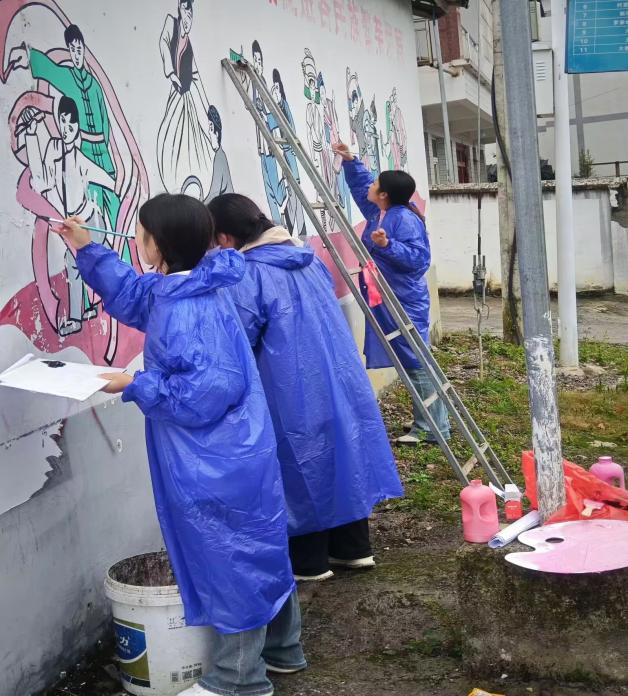 为了顺利完成预期目标,为鹰岩山村美丽乡村建设添砖加瓦,李浩副书记和美术学院巫峻老师冒着大雨前往绘画现场,为绘画的学生及时提供专业的指导,并根据墙绘工作进度对计划进行调整。