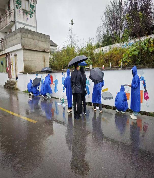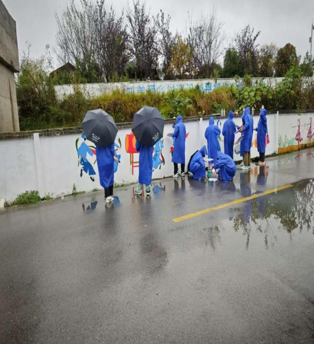 方案制定后,在带队老师的指导下,全体同学按计划前往各自负责的墙面开始绘画工作。但天公不做美,此时天上下起了淅淅沥沥的小雨,为了按时完成相应的绘画任务,同学们穿着雨衣,顶着寒风,依然坚持在雨中绘画。
